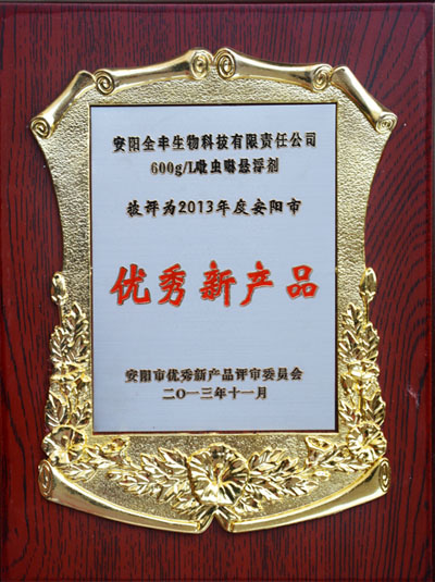 2013年11月,安陽市發(fā)改委組織有關(guān)專家對安陽全豐生物科技有限公司開發(fā)的600g/L吡蟲啉懸浮劑進(jìn)行了新產(chǎn)品鑒定。鑒定委員會聽取了項目匯報,審閱了有關(guān)技術(shù)材料,對現(xiàn)場進(jìn)行了考察,經(jīng)質(zhì)疑和討論,認(rèn)定600g/L吡蟲啉懸浮劑為安陽市優(yōu) 秀新產(chǎn)品。