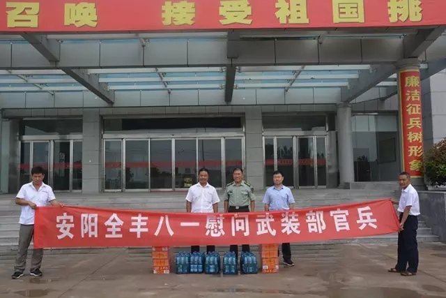 2016年8月1日,是中國(guó)人民解放軍建軍八十九周年的喜慶節(jié)日,安陽(yáng)全豐 生物科技有限公司副總經(jīng)理?xiàng)罴t軍、安陽(yáng)太行低空空間應(yīng)用職業(yè)培訓(xùn)學(xué)校校長(zhǎng) 陳磊一行受公司董事長(zhǎng)、總經(jīng)理王志國(guó)委托,到安陽(yáng)市消防 隊(duì)、駐安部隊(duì)、北 關(guān)區(qū)武裝部及武警安陽(yáng)市中隊(duì)進(jìn)行了“八一”建軍節(jié)走訪慰問。楊總一行代 表安陽(yáng)全豐生物科技有限公司全體員工向各位官兵致以親切的節(jié)日慰問,對(duì)他 們的工作致以崇高的敬意,祝愿全體官兵節(jié)日快樂、身體健康、工作順利,并 送上慰問品,受到基地官兵的熱烈歡迎。