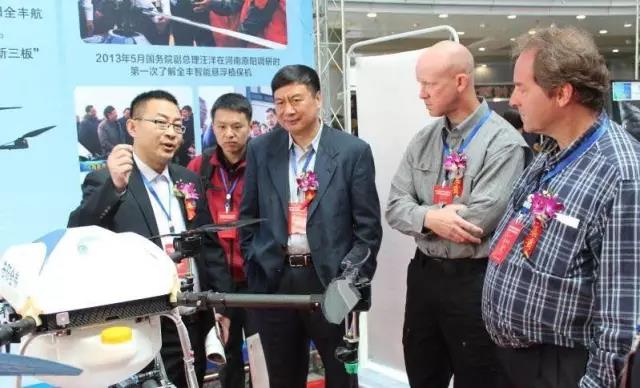 蘭玉斌教授帶著美國農(nóng)業(yè)部農(nóng)業(yè)科學(xué)研究署B(yǎng)radley K Fritz 高 級研究員和昆士蘭大學(xué)施藥與安全中心Andrew Hewitt 教授/主任 等一行學(xué)者前往安陽全豐航空展位參觀,并向兩位外賓介紹全豐,周總為參觀學(xué)者介紹全豐油機(jī)電機(jī)。