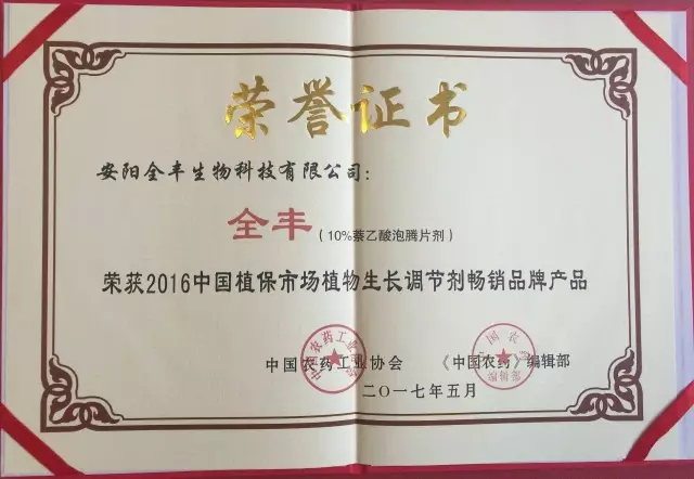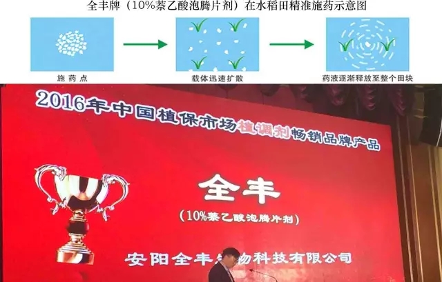 同時(shí),全豐牌10%萘乙酸泡騰片劑榮獲2016年中國植保市場(chǎng)植物生長(zhǎng)調(diào)節(jié)劑暢銷品牌產(chǎn)品。日子美(20%赤霉酸可溶粉劑)榮獲2016年中國植保市場(chǎng)最具市場(chǎng)爆發(fā)力品牌產(chǎn)品。