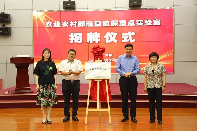 會議由華南農(nóng)業(yè)大學(xué)博士生導(dǎo)師蘭玉彬教授主持,實(shí)驗(yàn)室主任王志國致辭。之后全豐公司王志國董事長、華南農(nóng)業(yè)大學(xué)蘭玉彬教授、農(nóng)業(yè)農(nóng)村部南京農(nóng)業(yè)機(jī)械化研究所薛新宇研究員和安陽工學(xué)院張玲副校長代表四家共建單位共同為農(nóng)業(yè)農(nóng)村部航空植保重點(diǎn)實(shí)驗(yàn)室揭牌。