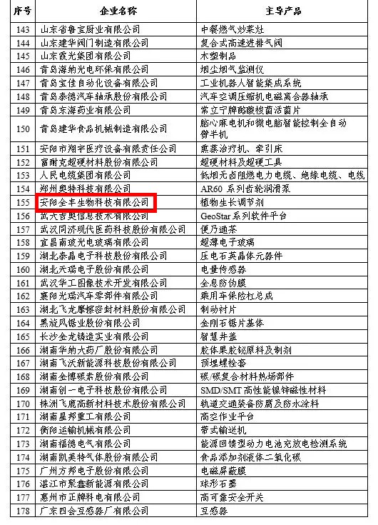 其中,河南有5家公司入選,分別是安陽全豐生物科技有限公司、富耐克超硬材料股份有限公司、人民電纜集團(tuán)有限公司、鄭州奧特科技有限公司和安陽市翔宇醫(yī)療設(shè)備有限責(zé)任公司。