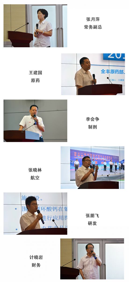 在述職環(huán)節(jié),原藥、制劑、航空、研發(fā)、財(cái)務(wù)、綜合等各分公司和部門第 一責(zé)任人依次進(jìn)行述職報(bào)告。原藥、制劑、航空還針對(duì)各自部門的銷售業(yè)務(wù)取得成績和團(tuán)隊(duì)建設(shè)等方面詳細(xì)進(jìn)行分析。